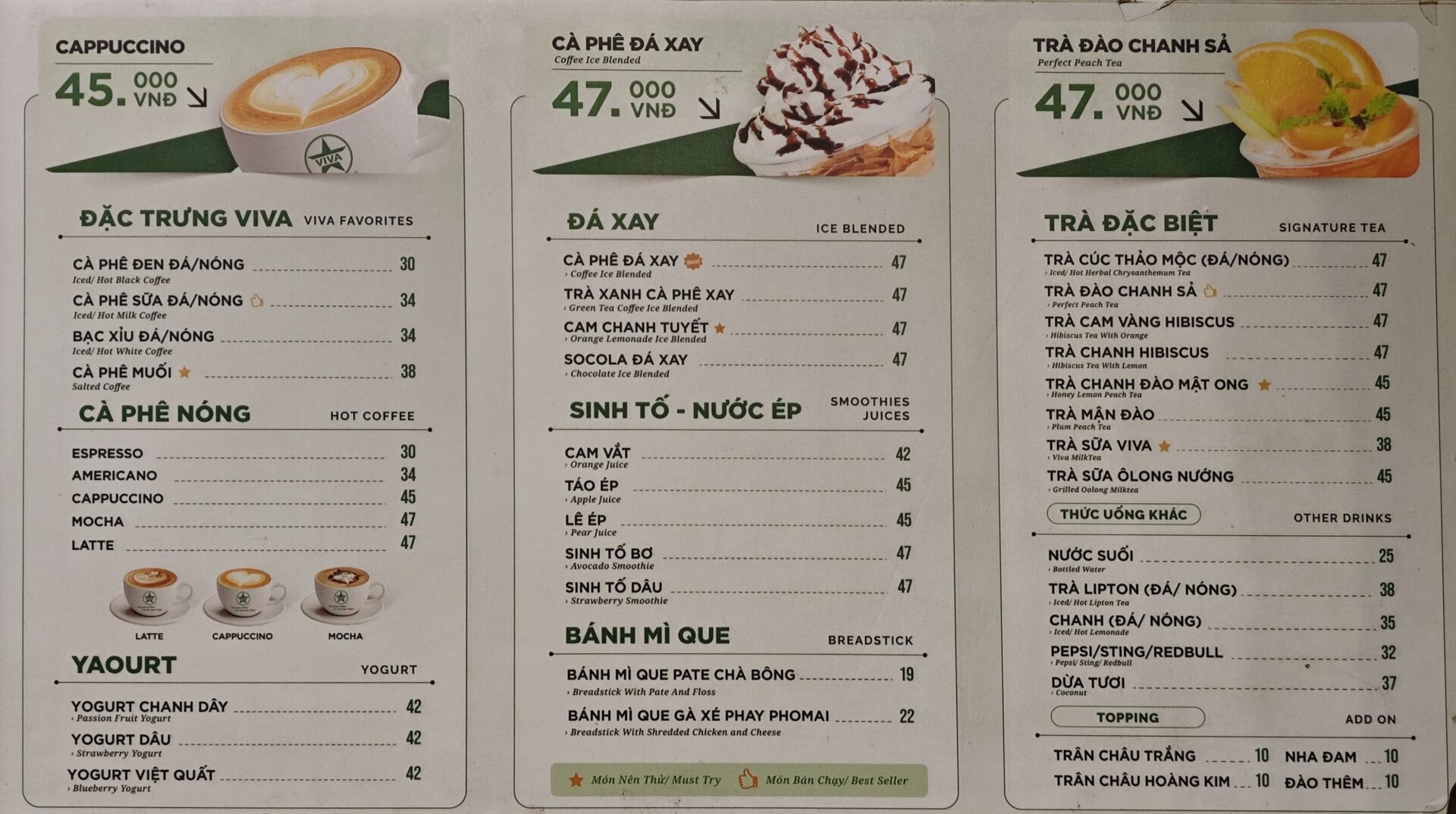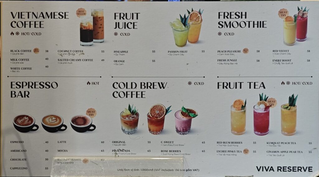 伝統的なベトナムコーヒーからフルーツジュース、スナック類と、幅広いラインナップで構成されています。価格帯は1杯35,000ドンから55,000ドン程度と、チェーン店の中でもかなり手頃な部類。