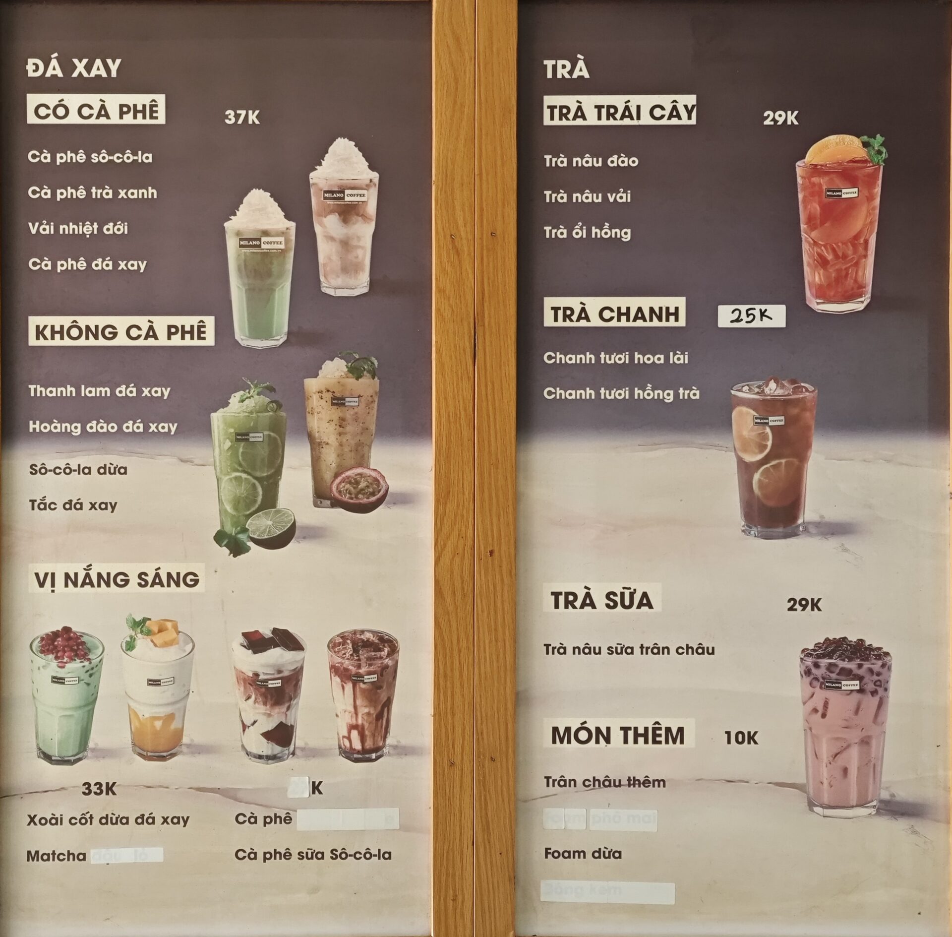 Milano Coffee」のメニューはこちら…って値段が書いてない!?