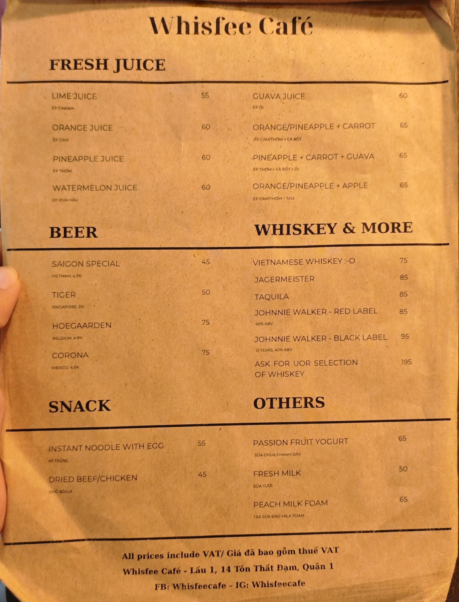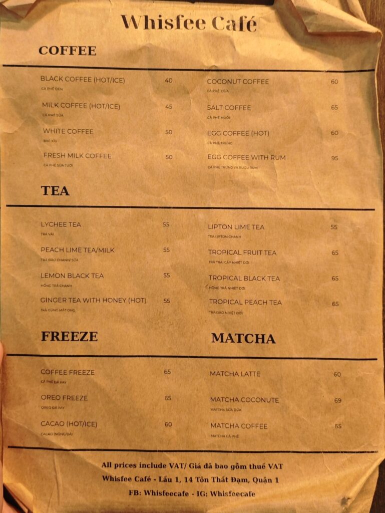 「Whisfee Café」のメニューはこちら。サイゴンの中心部にありながら、ドリンクは40,000ドンからと良心的。