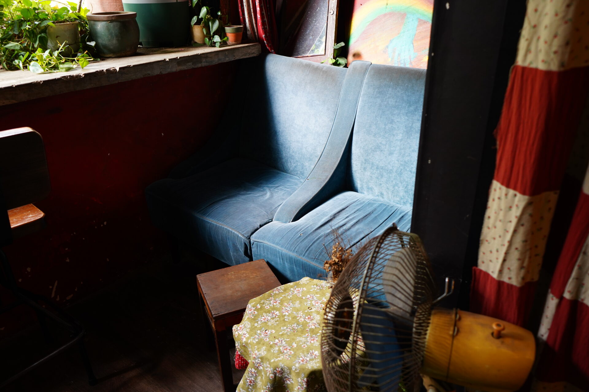 席ごとに異なる表情を持つヴィンテージ家具たちもまた魅力。赤いファブリックソファと木製のトランクテーブルの席で友人と語らうも良し、鮮やかなブルーの布張りチェアや、重厚な革張りのソファに深く腰掛けて一人の時間に耽るも良し。